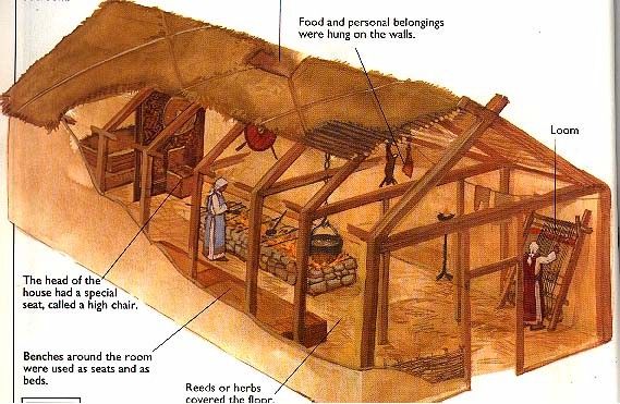 Os cômodos habitados da casa tinham uma lareira no meio do chão para dar calor, luz e meio de cozinhar. Não havia chaminés, e a fumaça da lareira saia pelas claraboias do teto, que era coberto de palha, torso ou tabuinhas de madeira, segundo a disponibilidade de materiais locais. Havia bancos ao longo das paredes. Geralmente eram parte integrante da estrutura e consistiam em montículos de terra aplanados e reforçados com vime por dentro. Havia poucos moveis mais, e os bancos serviam tanto de assento como de cama. Neles se faziam trabalhos manuais simples, como fiar, tecer e fazer cestos, mas algumas fazendas tinham edifícios separados para as atividades particulares.